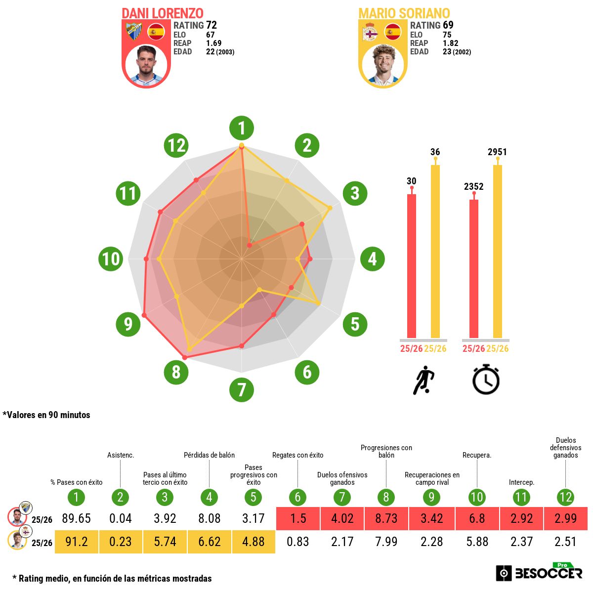 Dani Lorenzo, más diferencial en el uno contra uno. Promedia más regates con éxito (1.5 a 0.83), muchos de ellos para superar líneas de presión, se impone en progresiones con pelota y también en los duelos ofensivos con éxito (4.02 a 2.17). En las áreas, mismos goles (4), pero Soriano cuenta con bastantes más asistencias (8) que Dani (1).