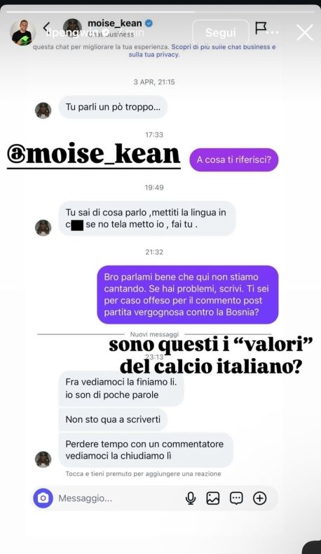 Fue ahí cuando se desató la tormenta de Moise Kean: "Sabes a lo que me refiero. Métete la lengua en el culo o lo haré yo mismo": Pengwin no se echó atrás y le respondió: "Háblame con cuidado. Si tienes algún problema, escríbeme. ¿Te ofendió el comentario después del vergonzoso partido contra Bosnia?".