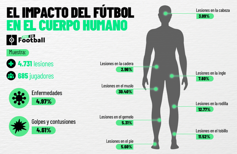 El fútbol duele. ProFootballDB, laboratorio de datos de BeSoccer, ya realizó un amplio estudio en el que comprobó cómo la práctica de este deporte afecta al cuerpo humano. Con el alargamiento de la temporada por la crisis del coronavirus, han aparecido nueve evidencias de ello en tan solo tres partidos.