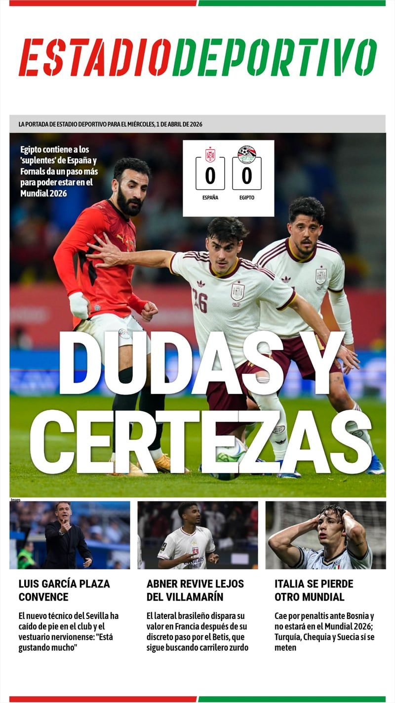 El amistoso de España ante Egipto, con los actos racistas ocurridos en la grada y el debut de Joan García, así como la tercera eliminación seguida de Italia, temas que llenan de aroma de Mundial los diarios deportivos nacionales e internacionales en este miércoles 1 de abril.